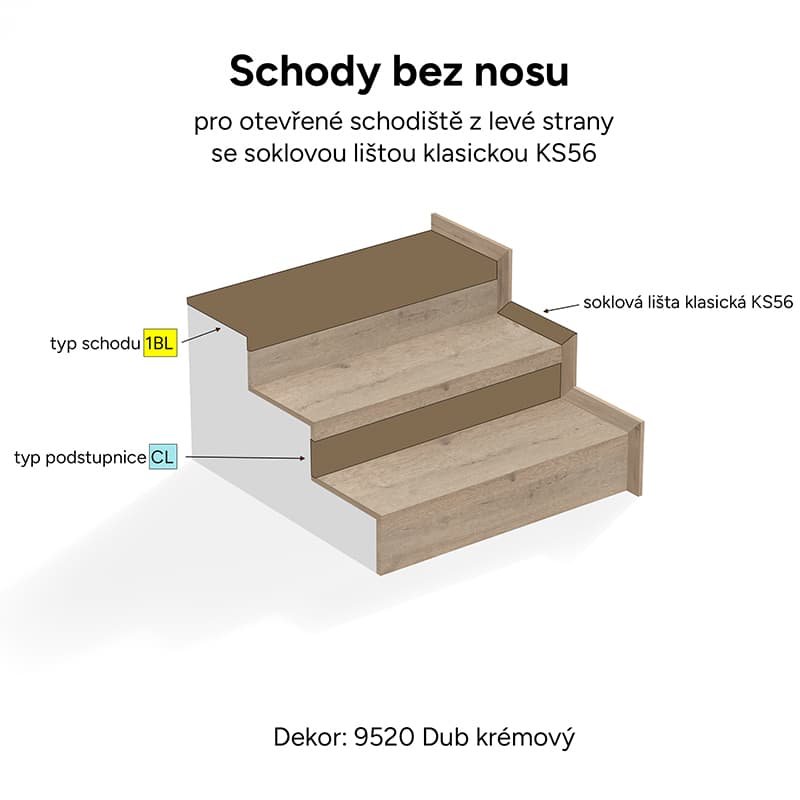 Vinylové schody Ecoline Step v dekoru 9520 Dub krémový ; dílec 1BL - schod bez nosu s boční úpravou (zleva) pro otevřené schodiště (zleva).