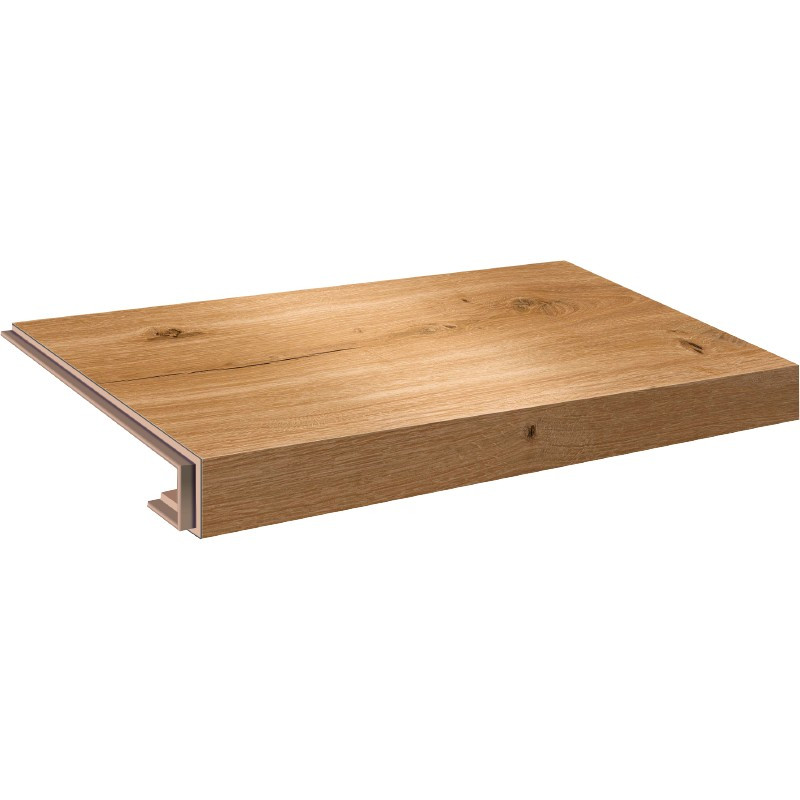 Vinylové schody v dekoru Ecoline Step - 9590 Dub královský hnědý, dílec 2A – schod s nosem pro uzavřené schodiště, vlevo i vpravo zámek.